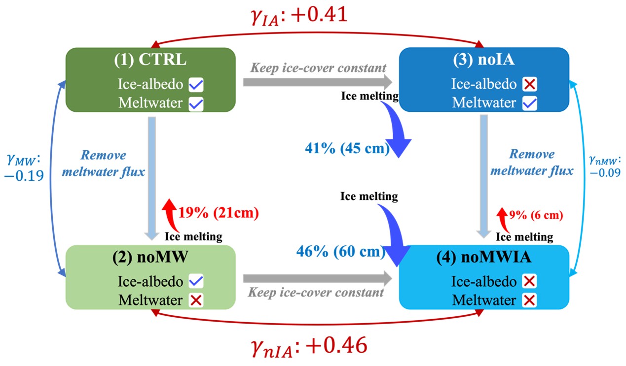 图1. 研究冰反照率和融水反馈的四个类型实验之间的关系示意图。CTRL:控制实验;noIA:移除冰-反照率反馈;noMW:移除融冰水反馈;noMWIA:同时移除冰-反照率反馈和融冰水反馈。