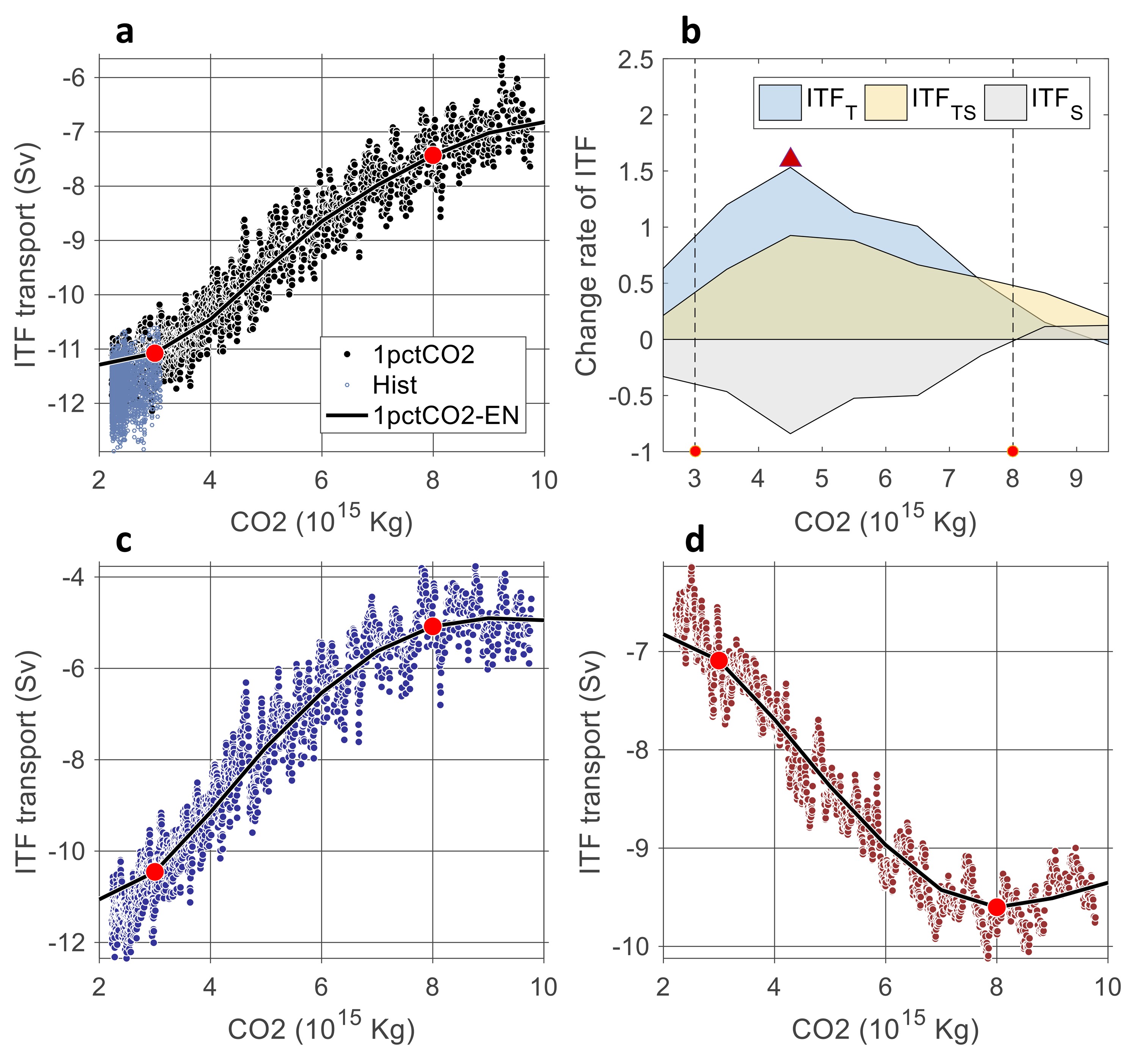 图1. 印尼贯穿流(ITF)流量对大气二氧化碳外强迫的响应。(a)ITF全流在1pctCO2和Hist试验中的响应;(b)ITF全流对CO2外强迫的响应速率;(c)和(d)分别是ITF的热容部分和盐容部分对CO2外强迫的响应。