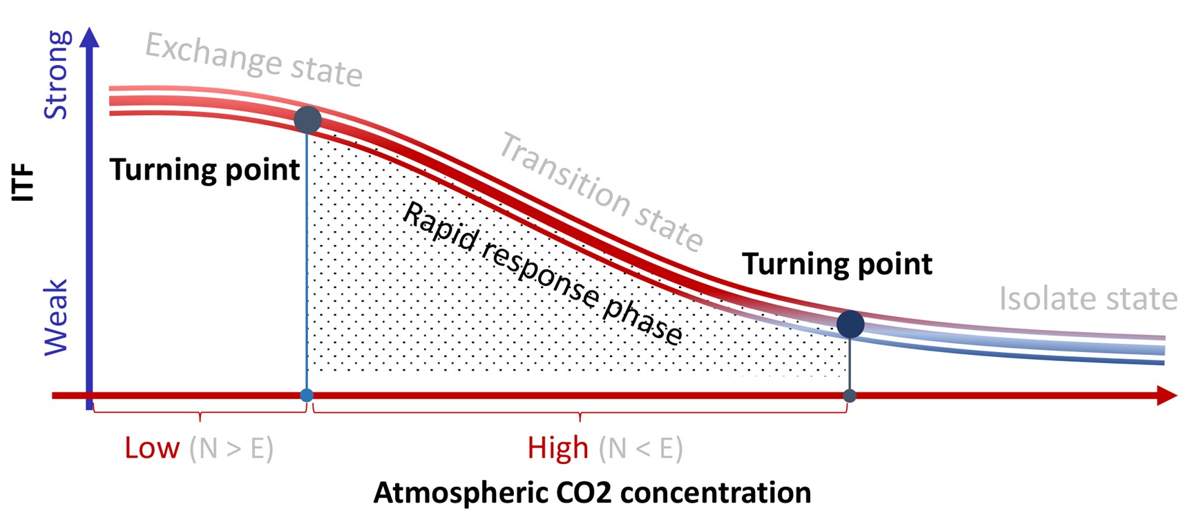 图2. 印尼贯穿流流量对大气二氧化碳外强迫的非线性响应示意图。