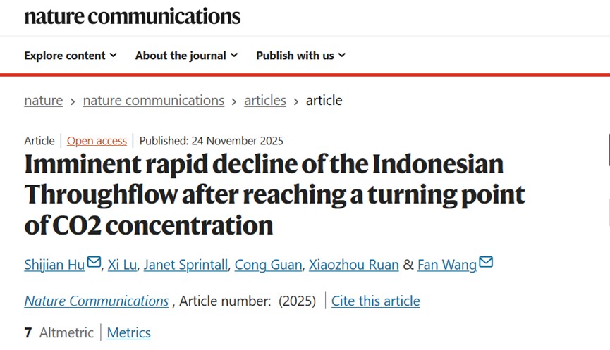 论文信息:Hu, S.*, X. Lu, J. Sprintall, C. Guan, X. Ruan, and F. Wang* (2025), Imminent rapid decline of the Indonesian Throughflow after reaching a turning point of CO2 concentration, Nature Communications, doi:10.1038/s41467-025-66746-0.